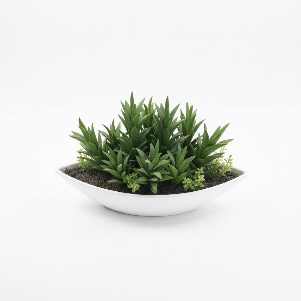 Aranzhim elegant me sukulente artificiale jeshile në vazo të bardhë në formë anije, i gatshëm për dekorimin e çdo ambienti pa nevojë mirëmbajtjeje. Baza me pamje dheu shton efektin natyral dhe të rregullt.