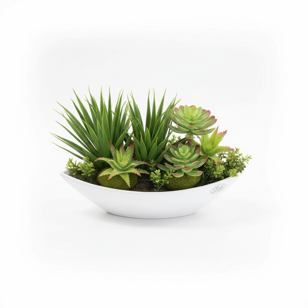 Aranzhim elegant me sukulentë artificialë të përzier në një vazo të bardhë me formë varke, ideal për dekor tavoline pa nevojë për mirëmbajtje. Gjethet realiste jeshile me majat e kuqe sjellin gjallëri dhe stil në çdo ambient të brendshëm.