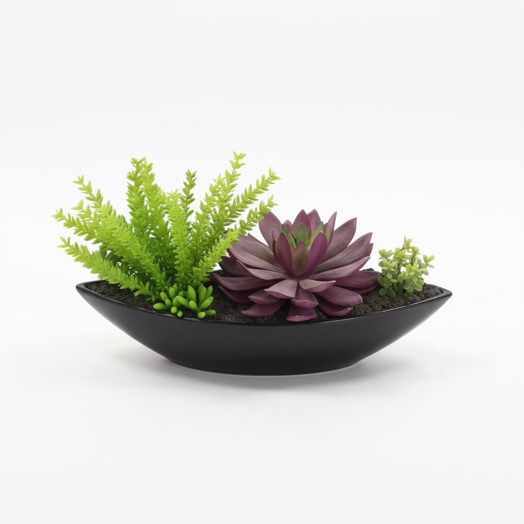 Aranzhim dekorativ me sukulentë artificialë jeshil dhe vjollcë në një vazo elegante të zezë në formë varke, ideal për tavolina dhe rafte. Shton ngjyrë dhe stil në çdo ambient pa nevojë për ujitje apo mirëmbajtje.