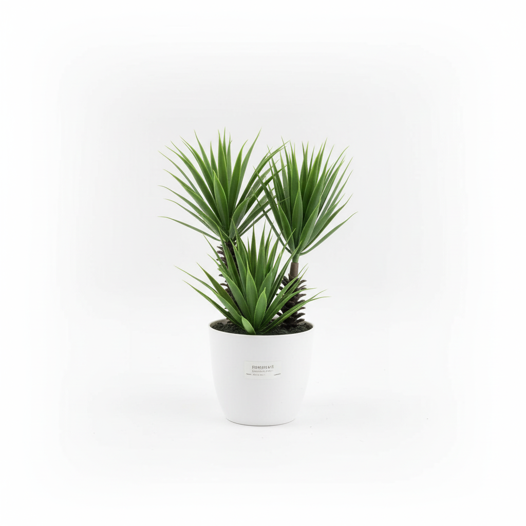 - Gjethe artificiale të dendura në formë yucca/dracaena për pamje moderne tropikale.