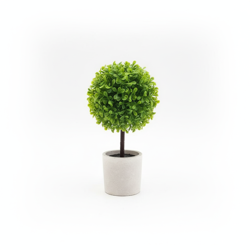Bima dekorative artificiale me formë topiary sjell gjelbërim të përhershëm në çdo ambient pa nevojë për mirëmbajtje. Dizajni kompakt e bën të përsosur për tavolina, rafte apo banakë.