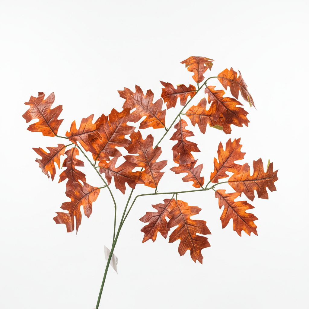 Degë dekorative artificiale me gjethe në formë lisi, në nuanca tipike vjeshte portokalli, kafe dhe të verdha. Ideale për vazo, aranzhime dhe dekor sezonal brenda ambienteve tuaja.