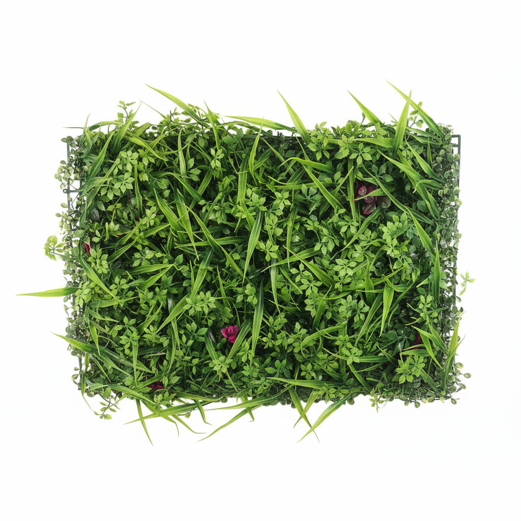 Panel dekorativ artificial me gjelbërim të dendur, ideal për krijimin e mureve vertikale ose mbulimin estetik të sipërfaqeve të brendshme apo të jashtme.