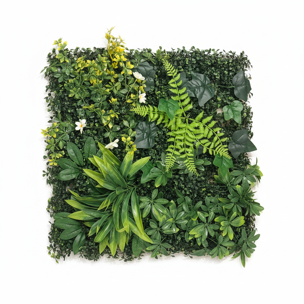 - Panel katror me gjelbërim artificial të dendur dhe gjethe të shumëllojshme për pamje voluminoze.
