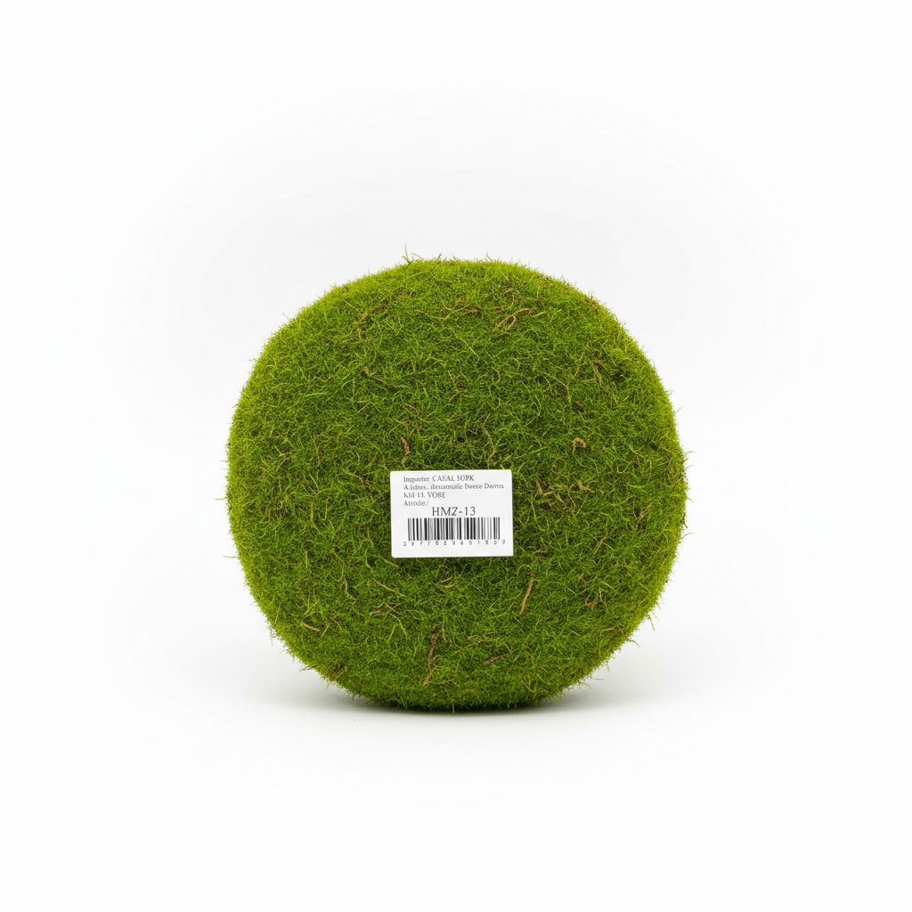 Qilim i rrumbullakët me sipërfaqe myshku artificial ngjyrë jeshile, i paketuar në qese plastike transparente, i përshtatshëm për dekorime dhe projekte artizanale.