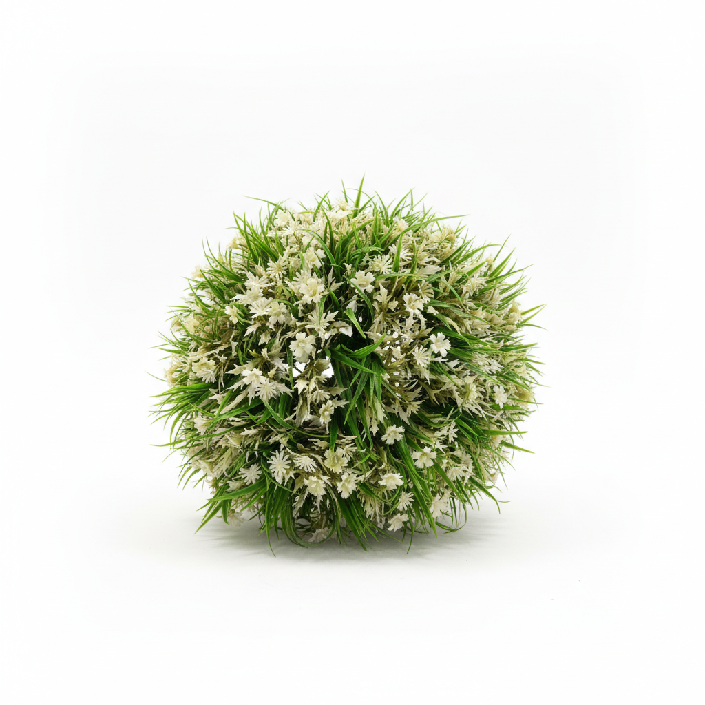 Topth dekorativ me bar artificial dhe lule të bardha të vogla, ideal për të sjellë gjelbërim elegant në çdo ambient pa nevojë mirëmbajtjeje. I përshtatshëm për zbukurim tavoline, raftesh ose varëse dekorative.