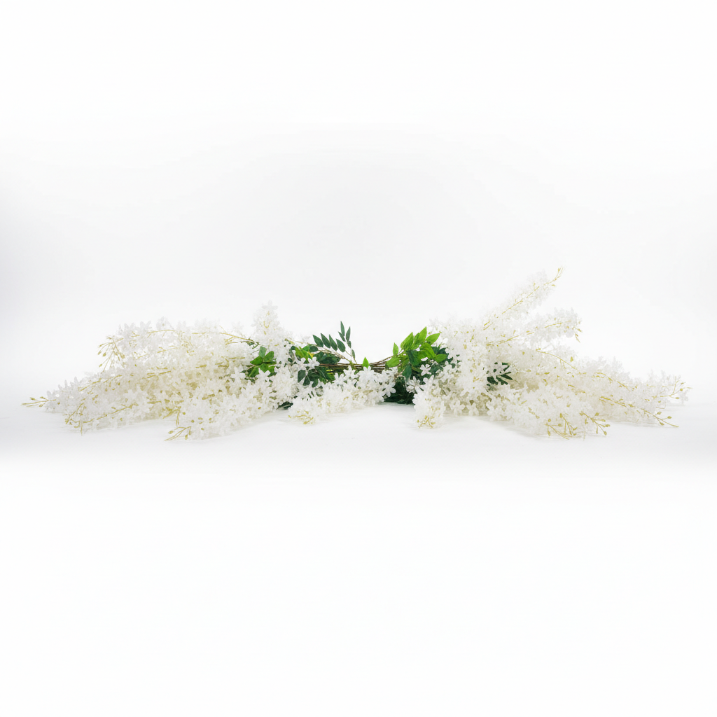 Shkurre varëse me lule artificiale të dendura në ngjyrë krem, me gjethe të gjelbra dhe disa kërcenj të gjatë, ideale për dekor të brendshëm dhe aranzhime florale. Materiali sintetik i lehtë e bën të thjeshtë vendosjen dhe kombinimin me dekore të tjera.