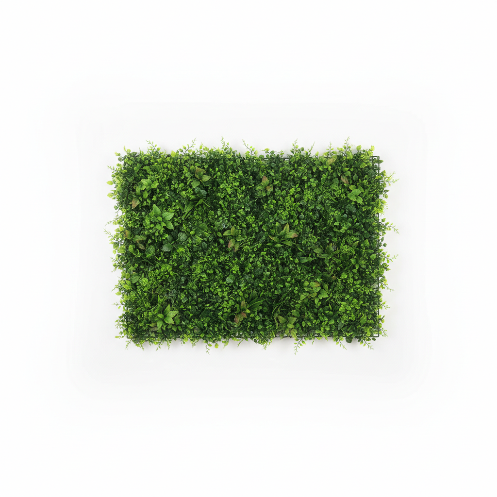 Panel drejtkëndor dekorativ me gjelbërim artificial të dendur, ideal për krijimin e një muri të gjelbër ose për mbulimin estetik të sipërfaqeve të ndryshme pa mirëmbajtje.