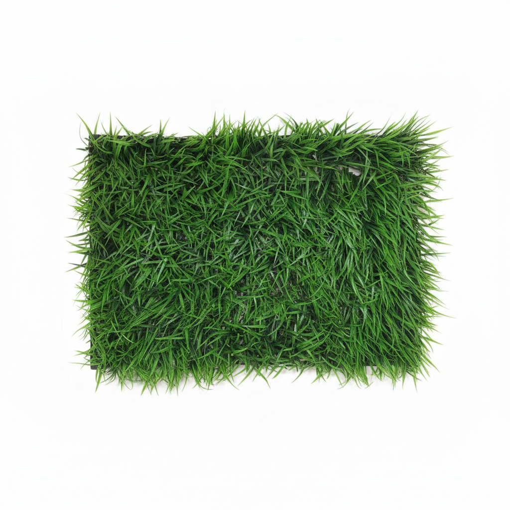 Panel dekorativ bari artificial me fije plastike të dendura në ngjyrë të gjelbër, i përshtatshëm për krijimin e mureve ose sfondit dekorativ në ambiente të brendshme.