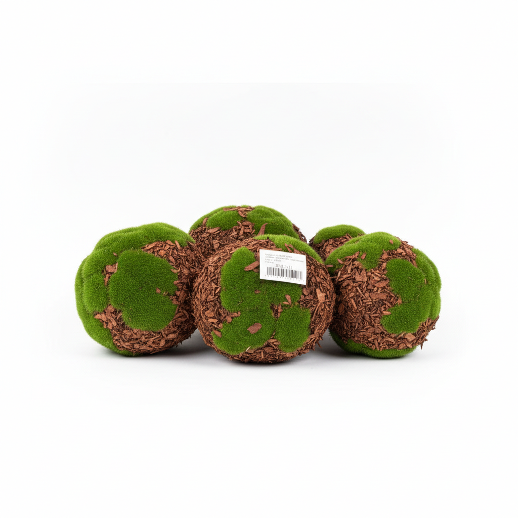 Set topthash dekorativë me myshk artificial jeshil dhe sipërfaqe lëvore druri, ideale për dekor të brendshëm dhe aranzhime florale. Vijnë në madhësi të ndryshme brenda një pakete plastike transparente.