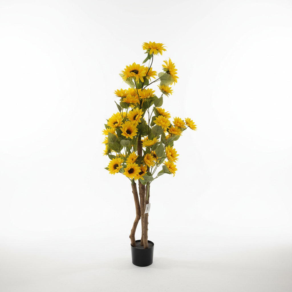 Bimë dekorative luledielli artificiale në vazo me shumë lule të verdha dhe gjethe jeshile realiste, ideale për zbukurim të brendshëm pa mirëmbajtje. Trungu shumëkrahësh duket natyral dhe qëndron vetë në një vazo të zezë me bazë dheu artificial.