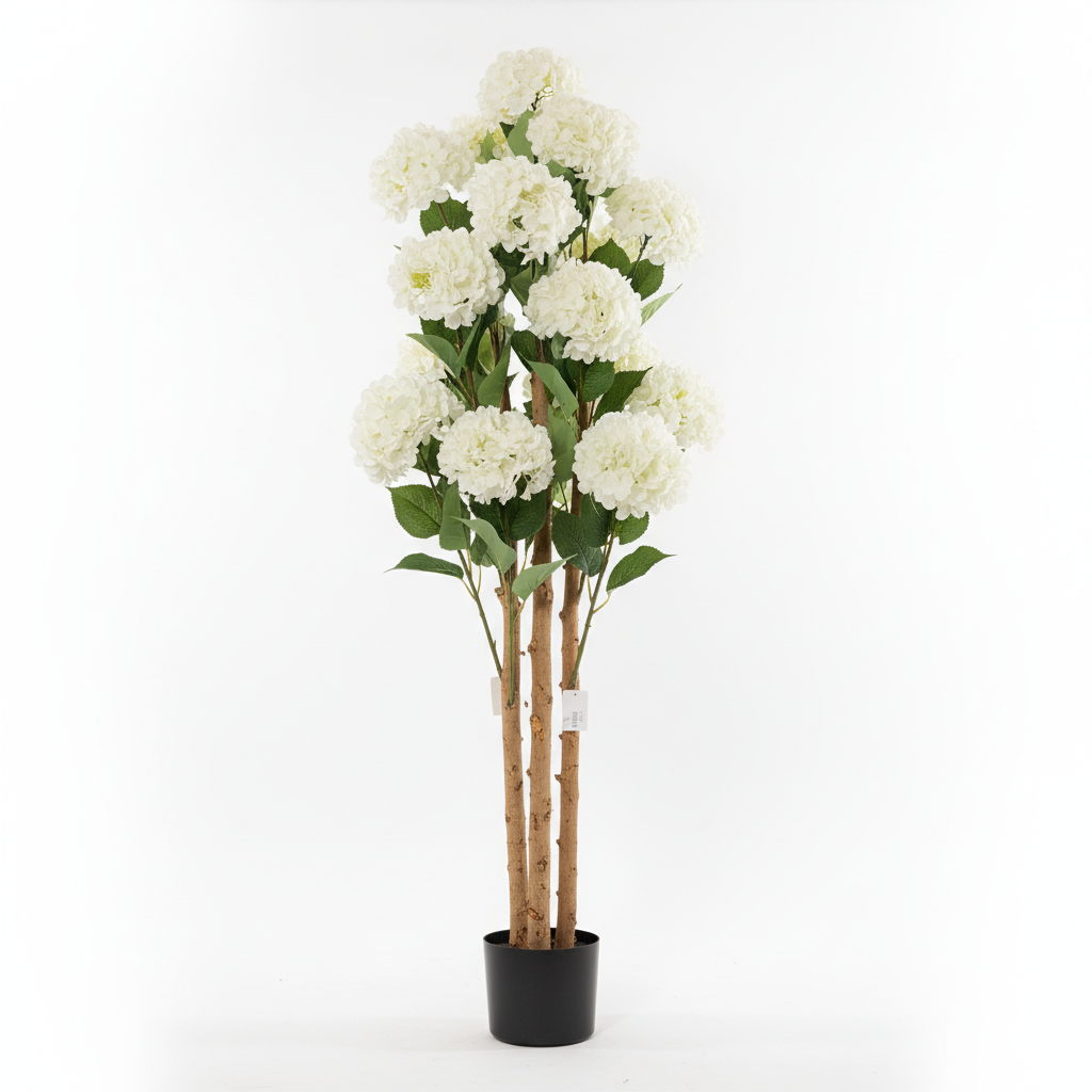 Pema artificiale me lule hortensie të bardha sjell pamjen e gjallë të natyrës në çdo hapësirë të brendshme pa nevojë për mirëmbajtje. E vendosur në vazo të zezë plastike, është zgjidhja ideale për dekor afatgjatë dhe elegant.