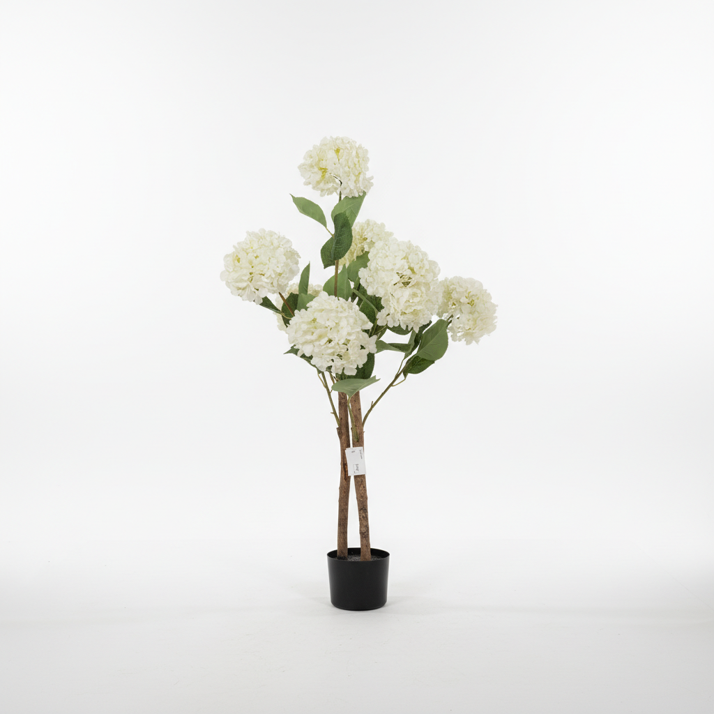 Bimë dekorative artificiale me tufa lulesh të bardha hortensie dhe gjethe jeshile me pamje natyrale, e vendosur në një vazo të zezë plastike për përdorim të brendshëm. Ideale për të sjellë gjallëri dhe elegancë në çdo ambient pa nevojë për mirëmbajtje.