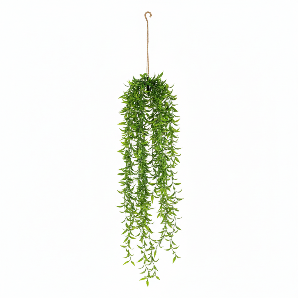 Bima artificiale varëse me gjethe kacavjerrëse jeshile sjell pamjen e gjelbërimit natyral brenda në shtëpi, pa pasur nevojë për mirëmbajtje. Ideale për ta varur në çdo cep të brendshëm për një dekor modern dhe të freskët.