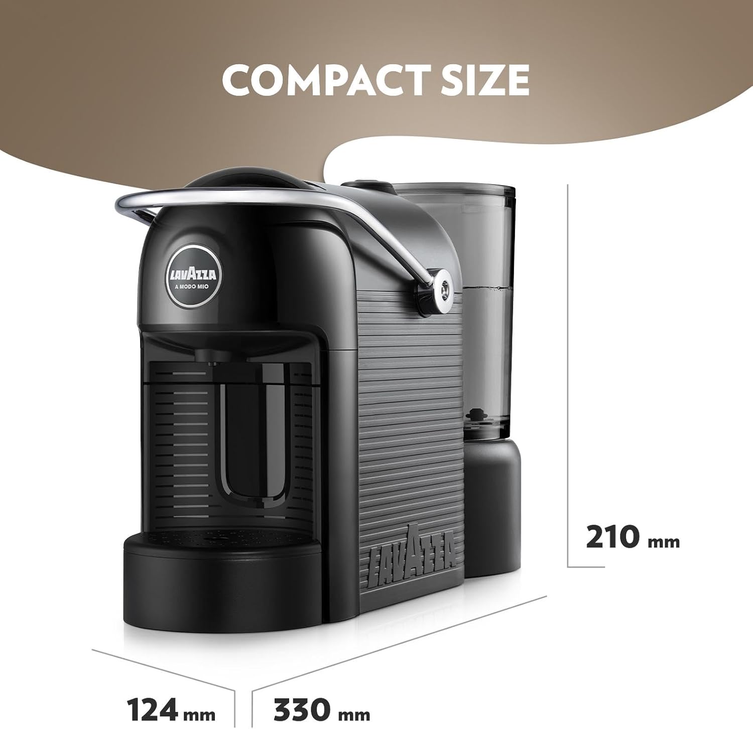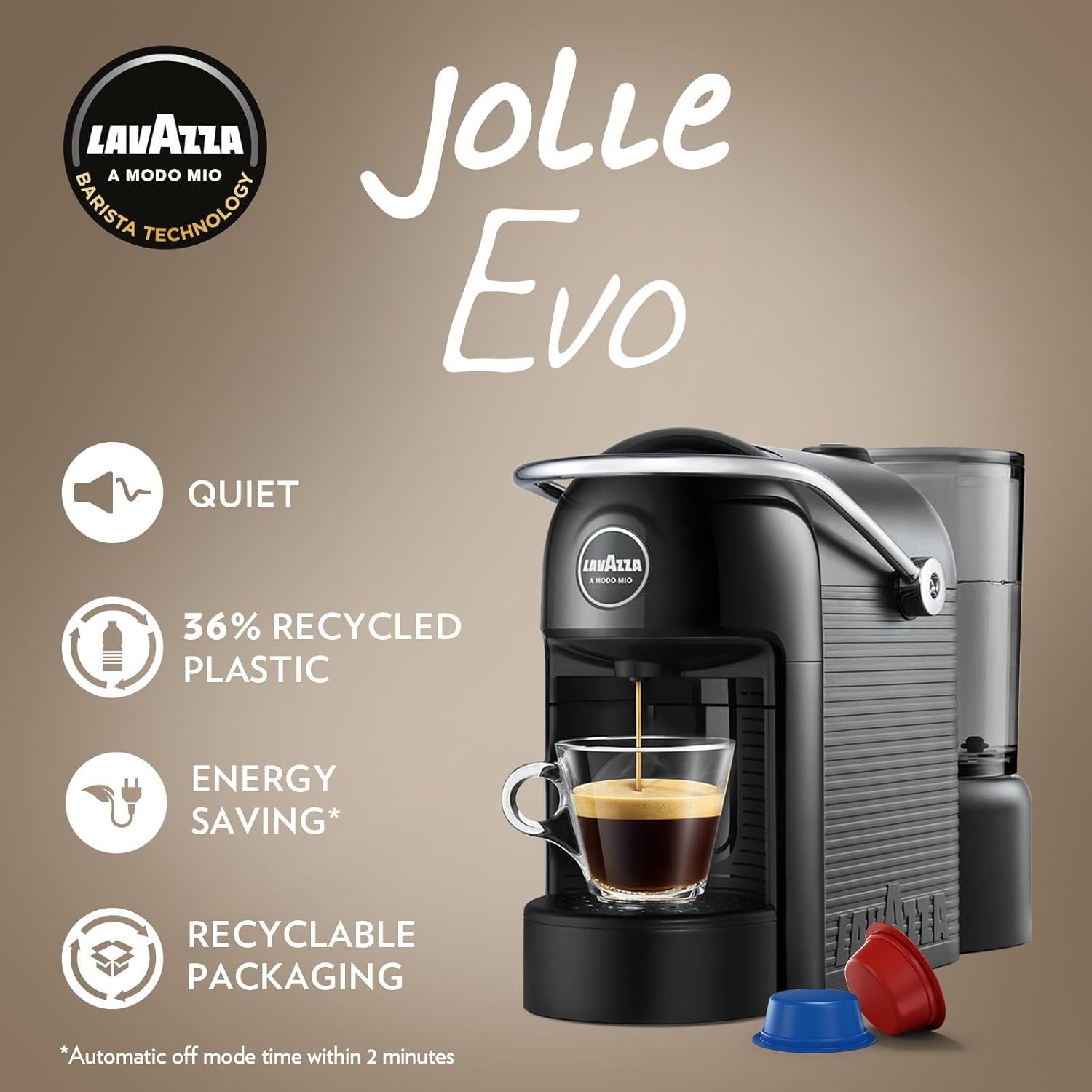 Makina është prodhuar me 36% plastikë të ricikluar, duke kontribuar në një përdorim më të qëndrueshëm dhe miqësor me mjedisin. Falë sistemit A Modo Mio, ajo përdor kapsulat origjinale Lavazza për shije të pasur dhe aromë intensive.