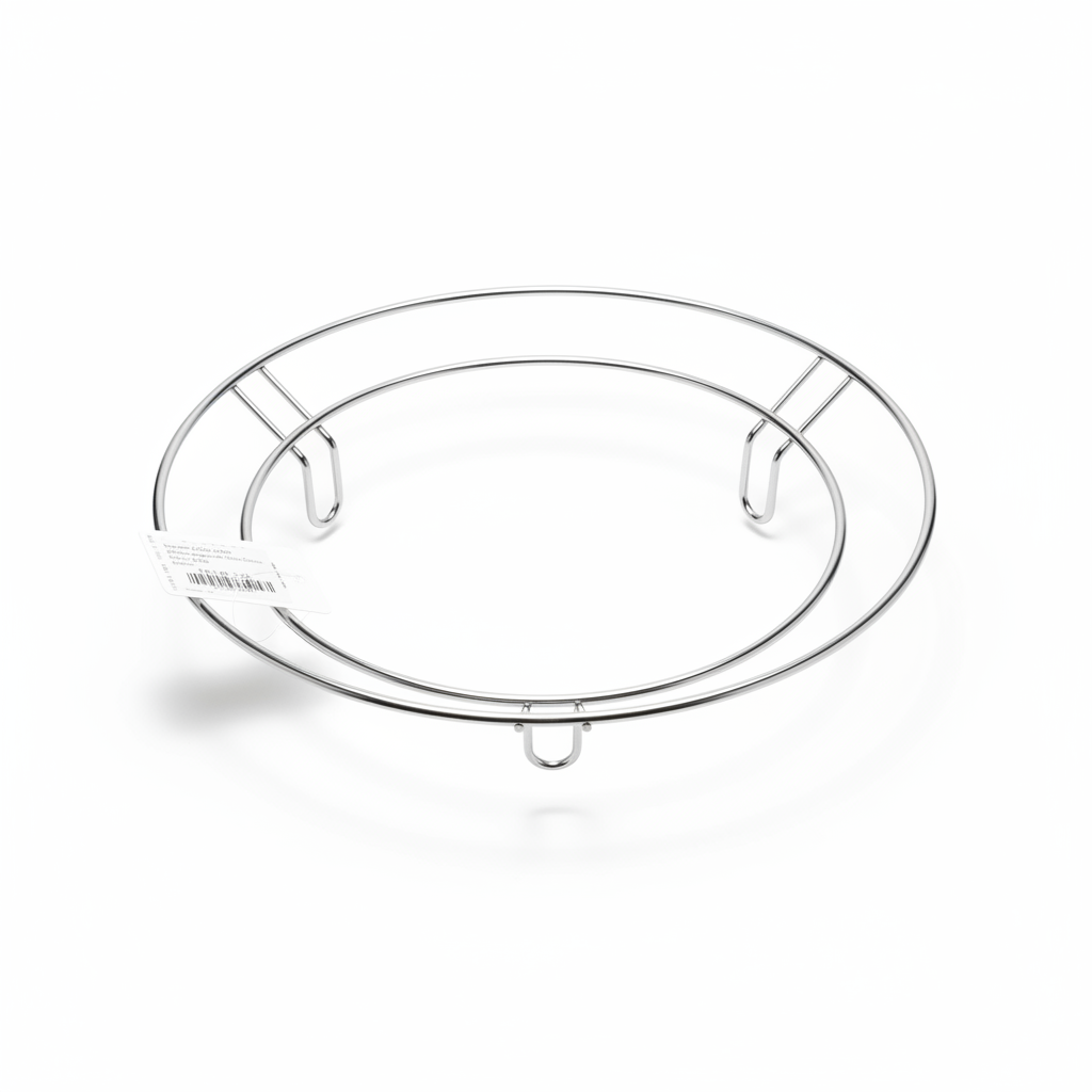Mbajtësi metalik rrethor me përfundim kromi mbron tavolinën dhe planin e punës nga enët e nxehta, duke i mbajtur ato të ngritura nga sipërfaqja. Konstrukti i tij me tela të hapur siguron qarkullim të mirë të ajrit për ftohje më të shpejtë të tenxhereve dhe tiganëve. Dizajni kompakt e bën ideal për përdorim të përditshëm në kuzhinë ose direkt mbi tryezë gjatë servirjes.