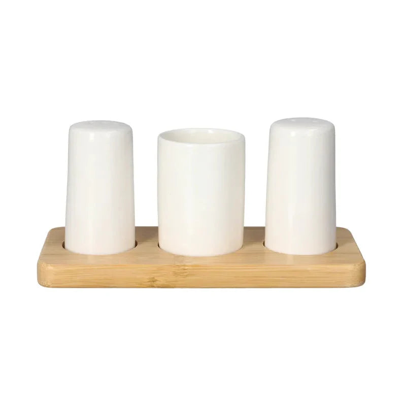 Set premium kripë & piper prej porcelani me mbajtëse druri, i kompletuar edhe me mbajtëse për kruese dhëmbësh.