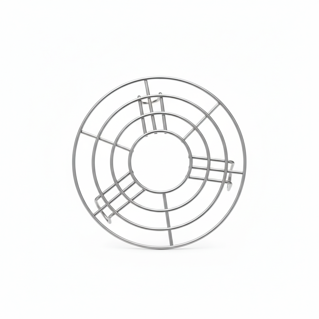 Projektimi me tela spirale rrethore dhe konstruksioni metalik krijojnë një bazë të qëndrueshme për tenxhere, tiganë ose çajnikë të vegjël. Këmbët e ngritura e mbajnë enën larg sipërfaqes, duke ndihmuar në mbrojtjen e tavolinave dhe banakëve nga nxehtësia e drejtpërdrejtë. Madhësia kompakte e bën të lehtë ruajtjen dhe përdorimin e përditshëm në çdo kuzhinë.