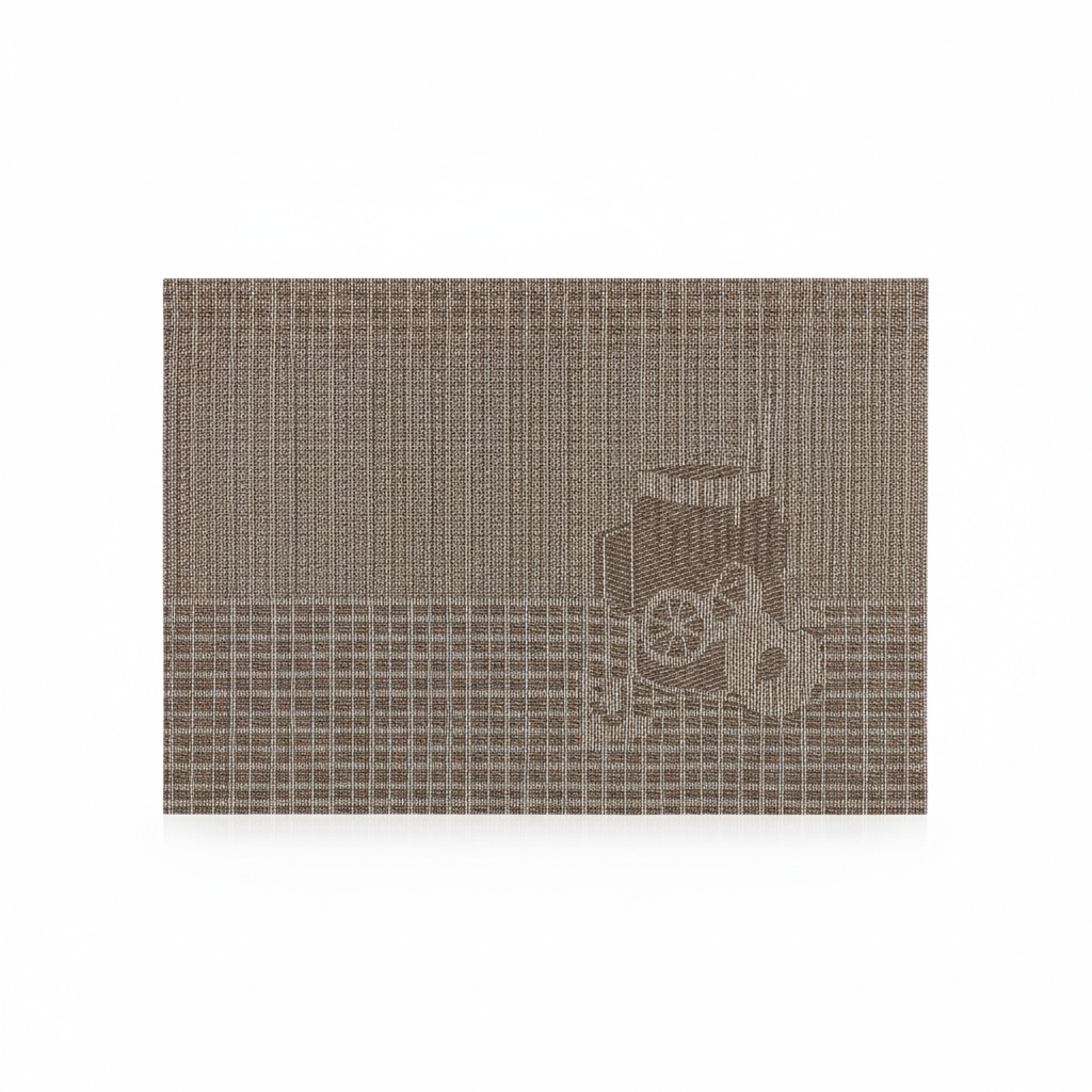 Napkë tavoline drejtkëndore prej materiali sintetik/PVC me thurje "basket-weave" në nuanca gri dhe bezh, që sjell një pamje moderne për çdo tryezë. Motivi dekorativ me çajnik dhe fetë agrumesh e bën të përshtatshme si për përdorim të përditshëm, ashtu edhe për servirje më të veçantë.