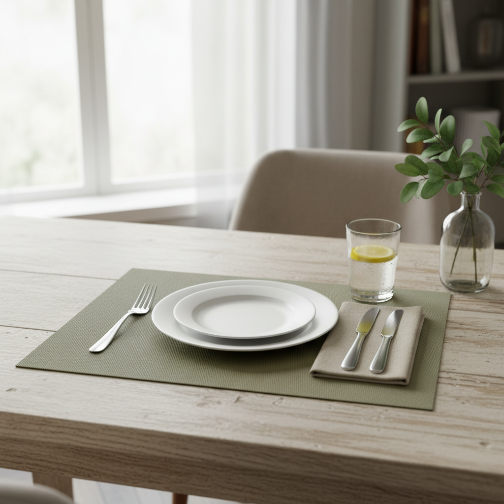Kjo napë tavoline drejtkëndore në ngjyrë ulliri sjell një pamje moderne dhe të rregullt në tryezën tuaj, duke u kombinuar lehtësisht me enë të ndryshme. Sipërfaqja e saj e endur me teksturë dekorative ndihmon në mbrojtjen e tavolinës nga nxehtësia dhe njollat.