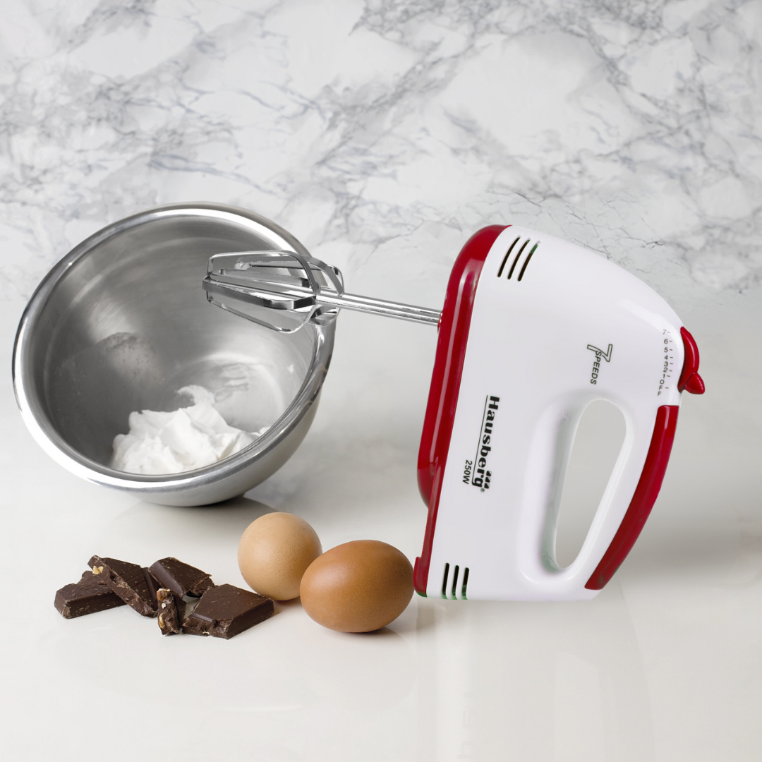 Mikseri dore Hausberg HB-4112RS është një pajisje elektrike praktike për përdorim shtëpiak, e përshtatshme për përgatitjen e përzierjeve të ndryshme gjatë gatimit dhe përgatitjes së ëmbëlsirave. Me fuqi 250 W dhe 7 nivele shpejtësie, ofron kontroll të mirë gjatë përzierjes së përbërësve me konsistenca të ndryshme.