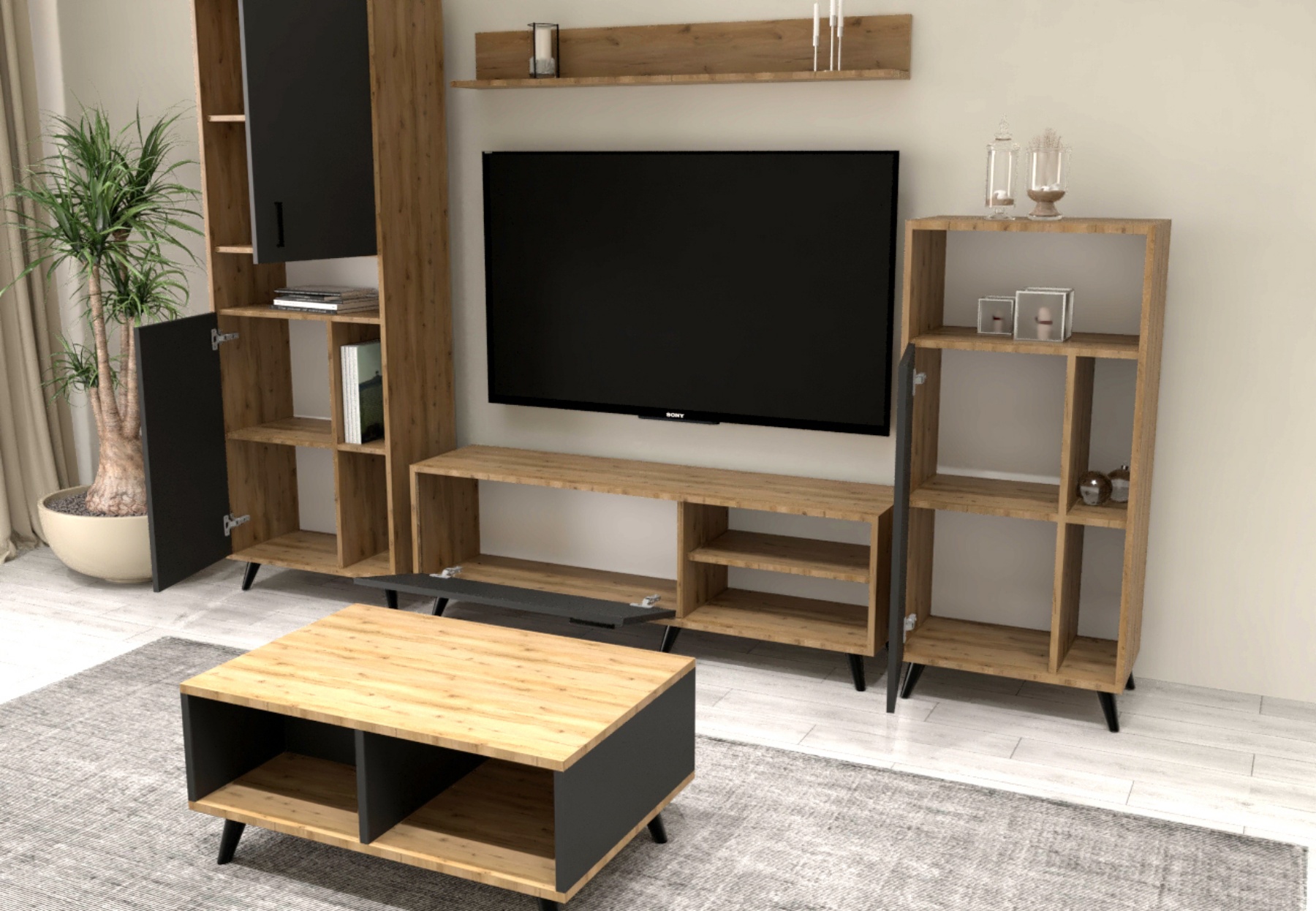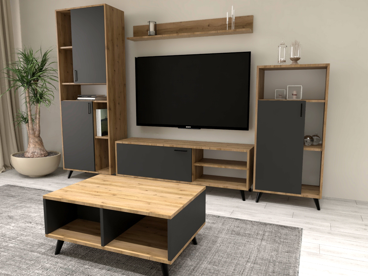 AURELIA është një komplet praktik dhe modern që përmban elementë bazë për rregullimin e dhomës së ndenjes. Me dizajnin e tij të thjeshtë por elegant, përshtatet lehtësisht në ambiente të ndryshme të brendshme dhe ofron hapësirë funksionale për ruajtjen dhe ekspozimin e sendeve.