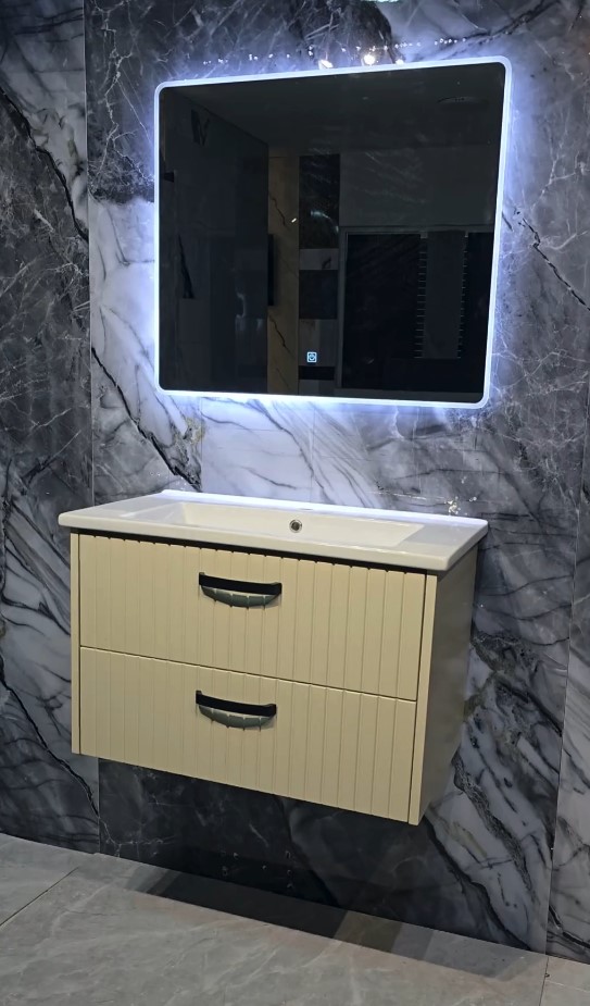Set elegant për banjo i përbërë nga mobilje MDF e lyer 80 cm në ngjyrë Platinium Bezh, lavaman 80 cm NEWARC dhe pasqyrë LED 80 x 70 cm. Zgjidhje ideale për ambiente moderne dhe funksionale.