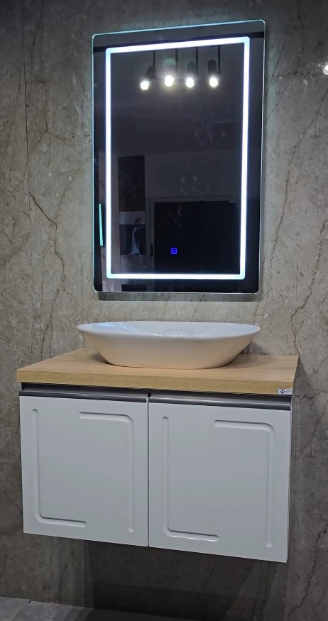 Mobilje Banjo MDF me PVC 80cm Bona + Lavaman 60cm Sistema Y Soft + Pasqyre LED 60x90cm 4603A