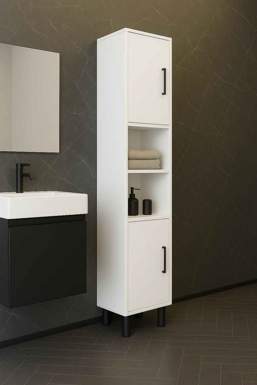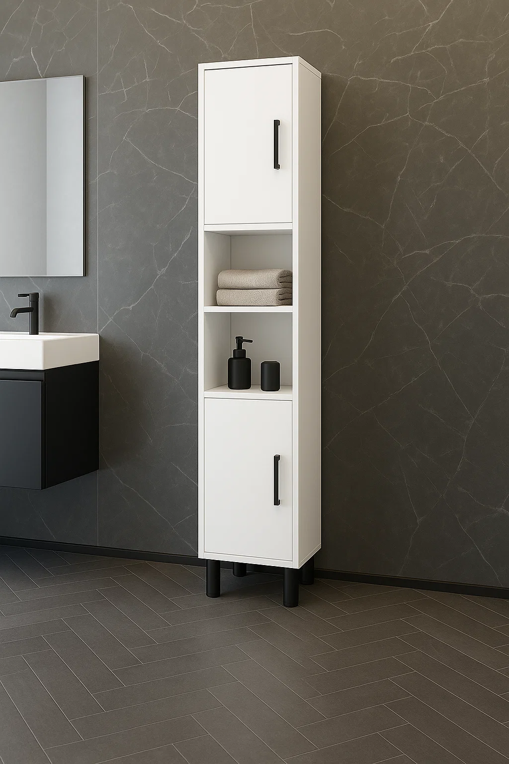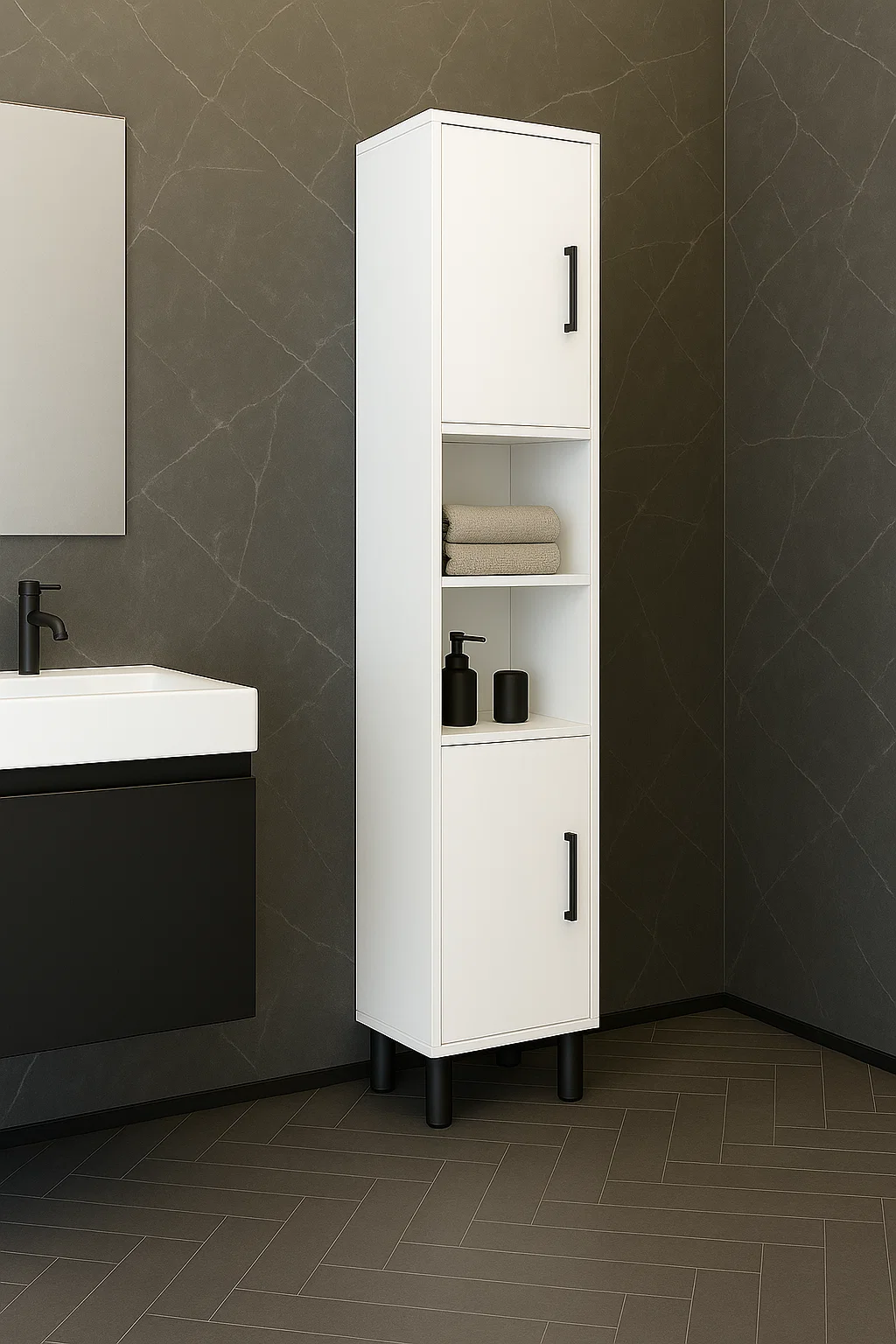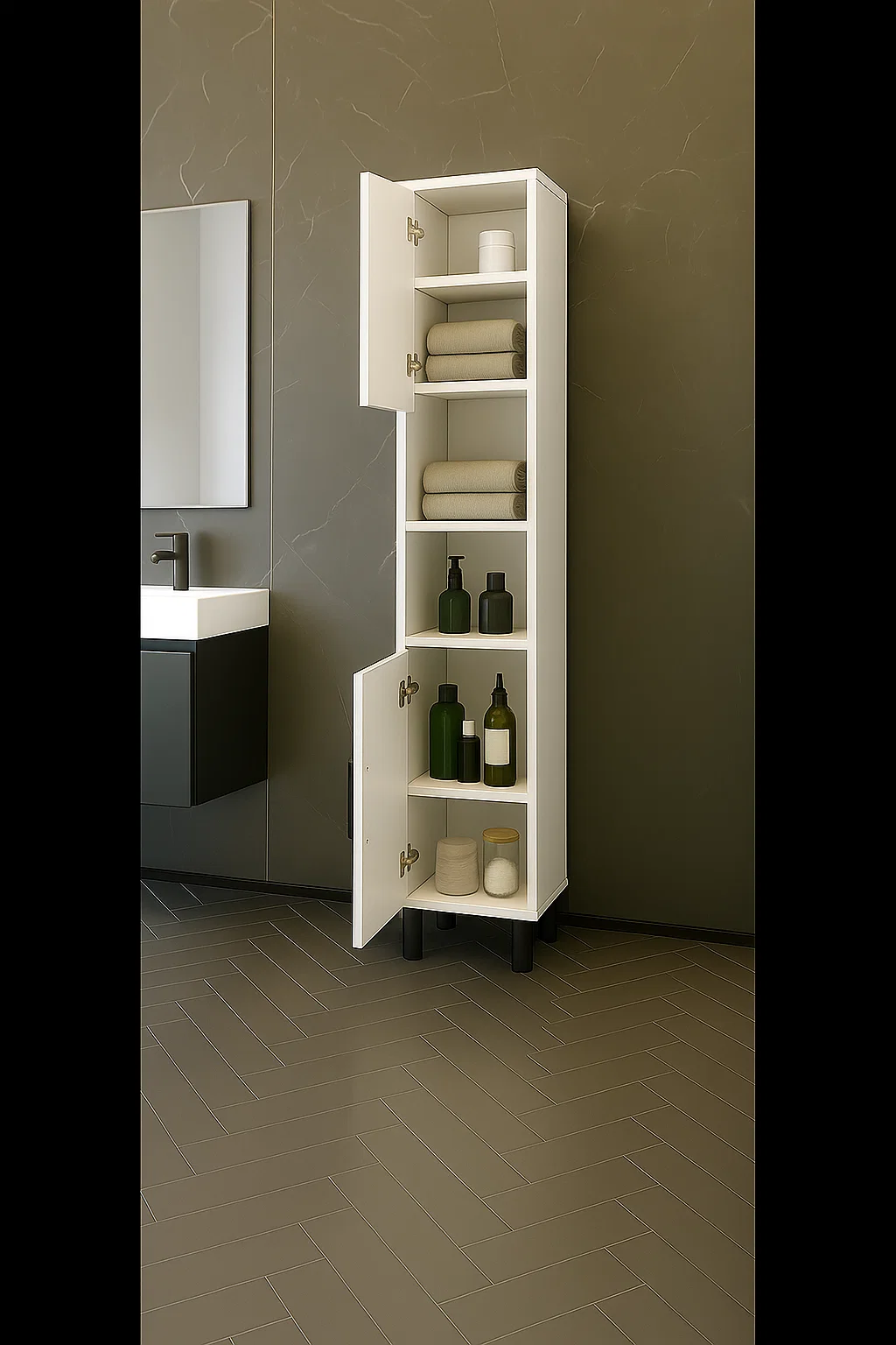 SLIMORA është një dollap elegant dhe i ngushtë i projektuar posaçërisht për banjo moderne me hapësirë të kufizuar. Me një lartësi prej 180 cm dhe një gjerësi prej vetëm 30 cm, ky dollap ofron ruajtje optimale pa zënë shumë hapësirë. Është ideal për peshqirë, kozmetikë, artikuj tualeti dhe gjithçka që ju nevojitet për një banjo të rregullt dhe funksionale.