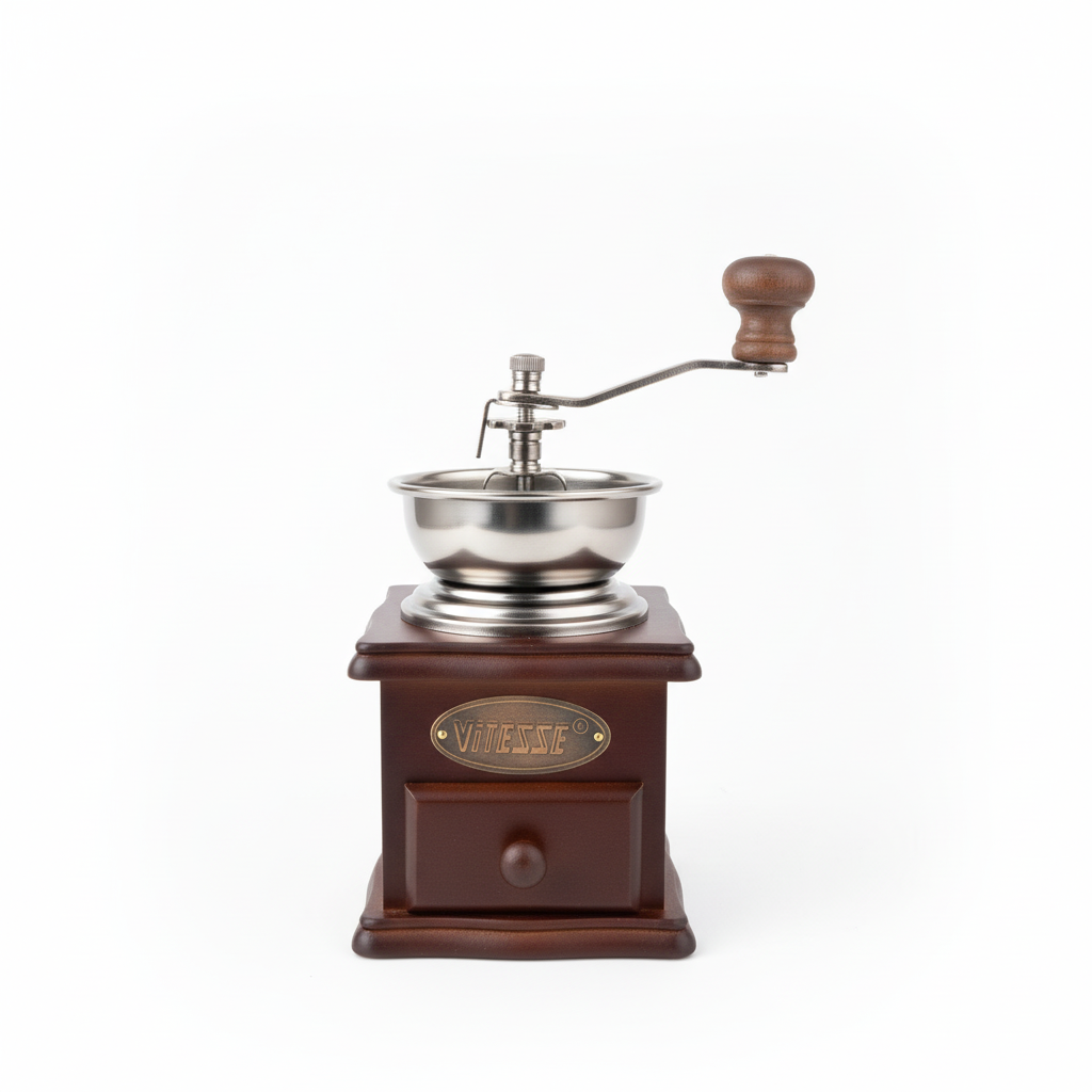 Mulli manual kafeje me trup prej druri, tas metalik dhe sirtar praktik për kokrrat e bluara, ideal për një prekje klasike në kuzhinë.