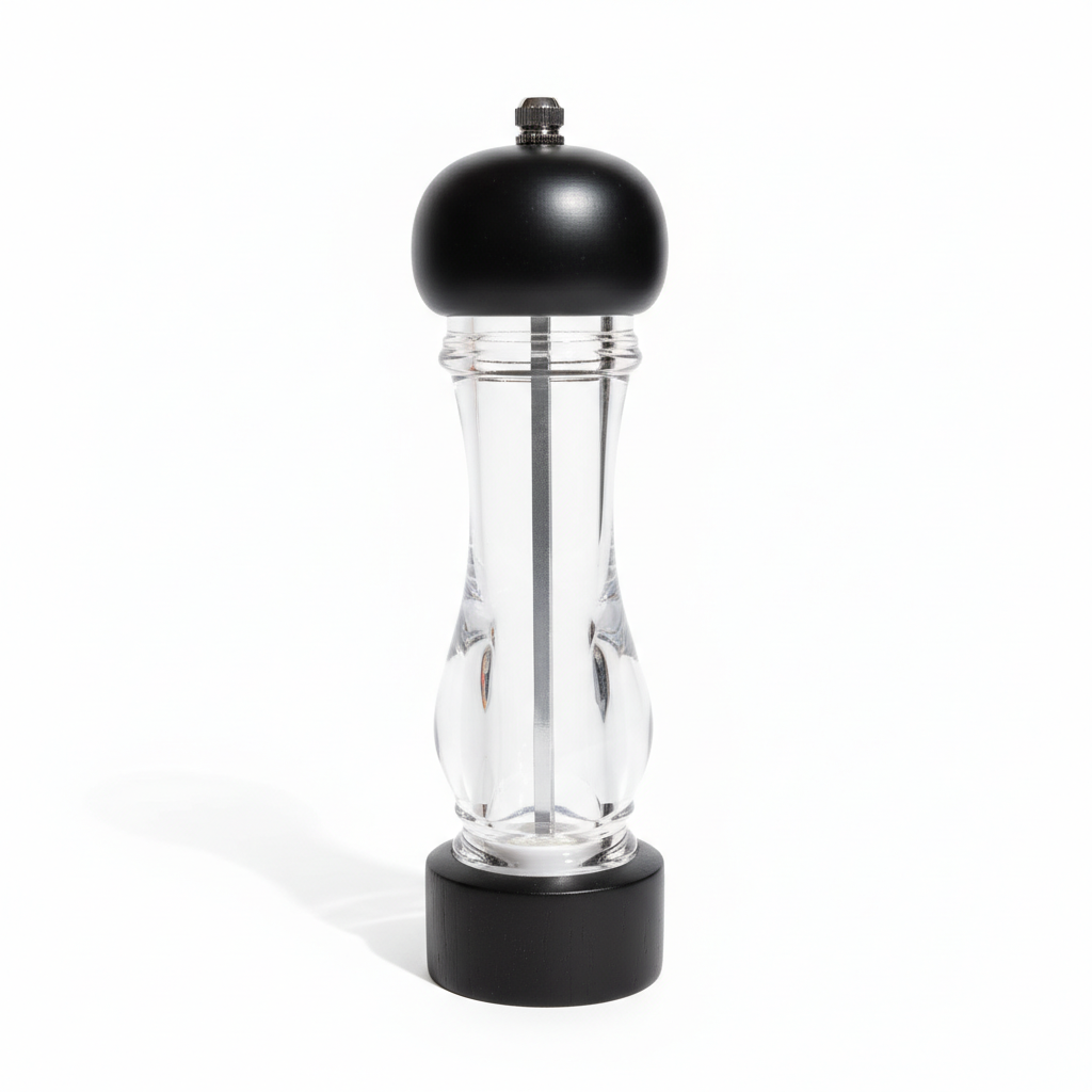 Mulli manual me trup qelqi transparent ju lejon të shihni sasinë e erëzave, duke sjellë stil modern në tavolinë. Kapaku dhe baza në ngjyrë të zezë ofrojnë pamje elegante dhe qëndrueshmëri gjatë përdorimit të përditshëm.