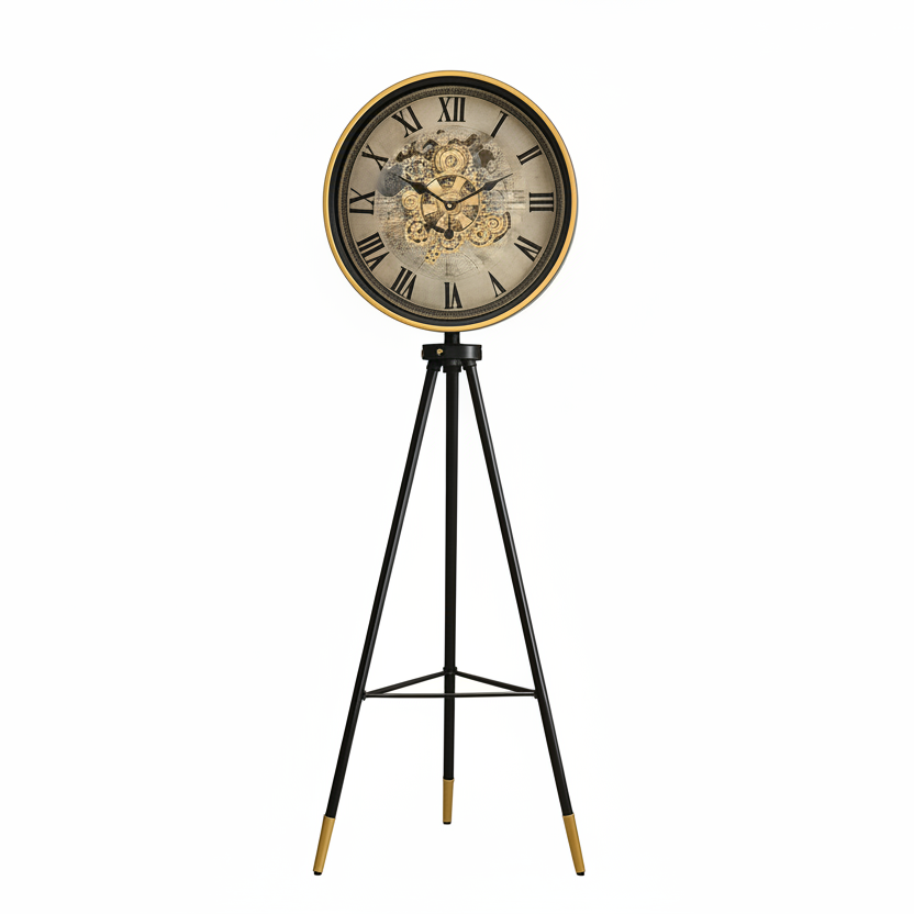 Orë dyshemeje me dizajn modern dhe karakter industrial, e vendosur mbi një strukturë trekëmbëshe elegante metalike. Forma rrethore e orës me kornizë në ngjyrë ari krijon një kontrast të bukur me bazën e zezë, duke e bërë një element dekorativ tërheqës për çdo ambient.