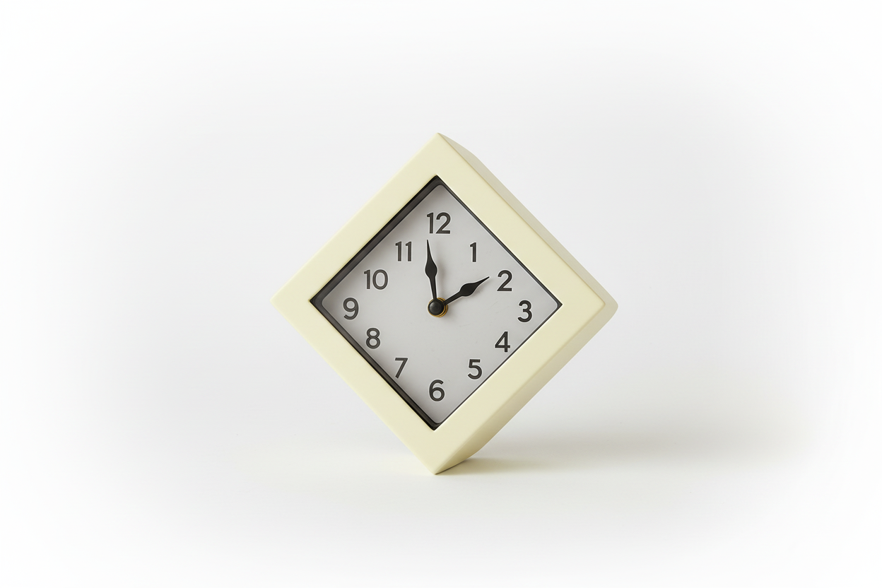 Orë tavoline me dizajn të thjeshtë dhe elegant, e karakterizuar nga forma katrore e vendosur në kënd, që i jep një pamje moderne dhe të veçantë. Korniza në ngjyrë krem krijon një ndjesi të ngrohtë dhe harmonike, ndërsa fusha e bardhë me numra të qartë siguron lexueshmëri të lehtë në çdo moment.