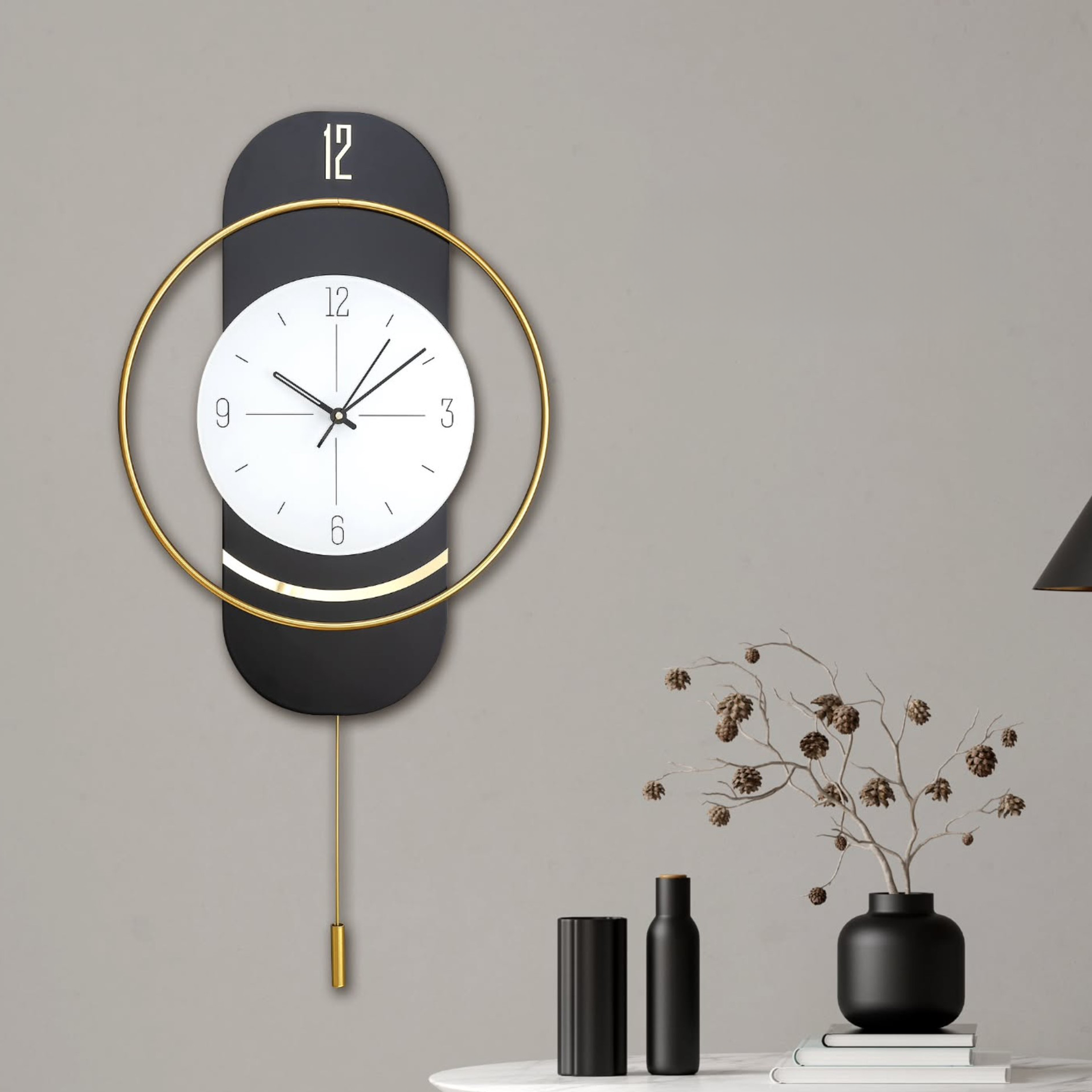 Orë muri dekorative me dizajn modern dhe element penduli, e krijuar për ambiente elegante dhe bashkëkohore. Kombinimi i panelit të zi mat me rrethin metalik në ngjyrë ari krijon një kontrast luksoz dhe të sofistikuar.