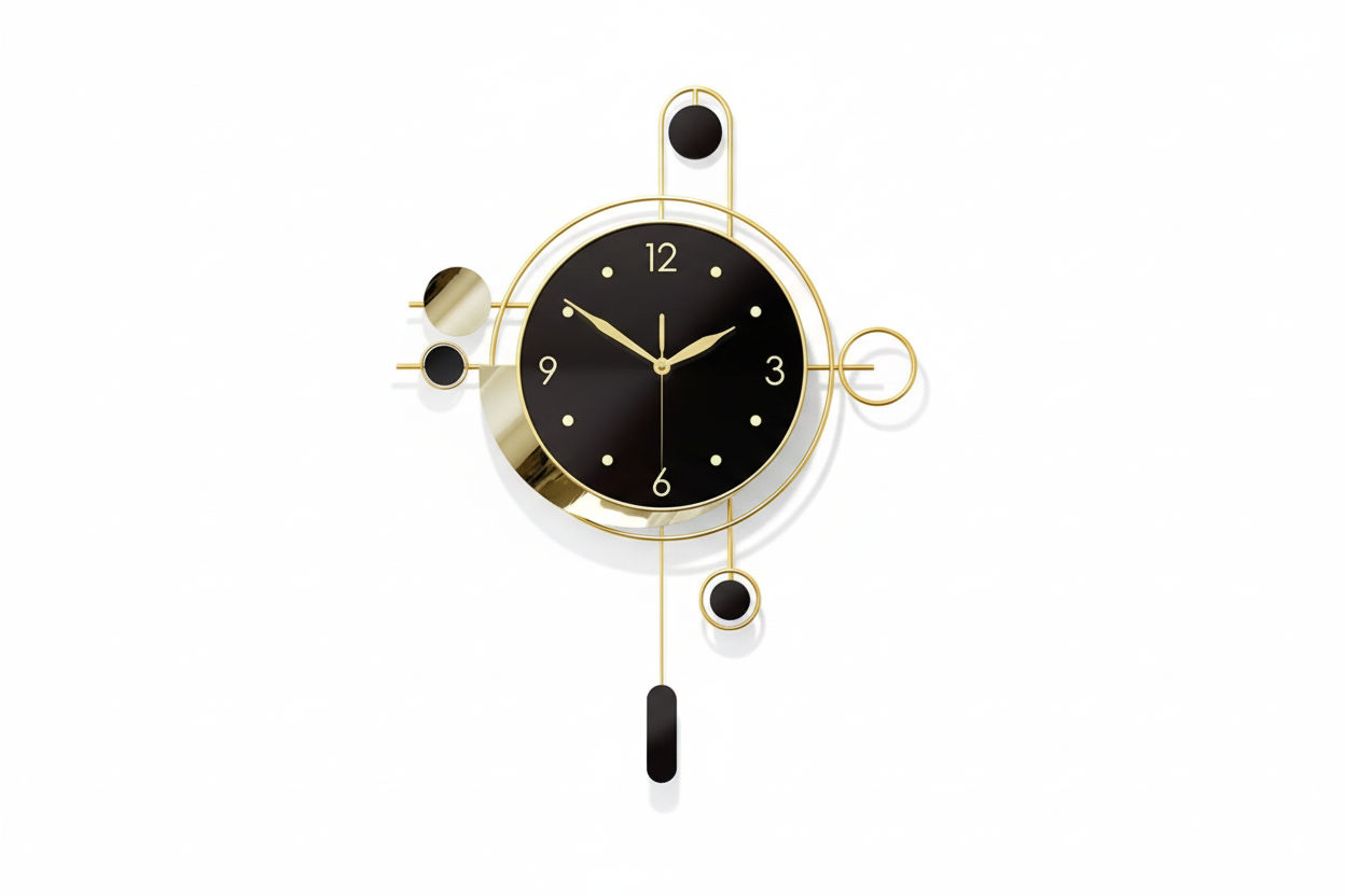 Orë muri me dizajn modern dhe elegant, e karakterizuar nga kombinimi i ngjyrës së zezë me detaje të arta që krijojnë një pamje luksoze dhe bashkëkohore. Forma rrethore e cadranit dhe elementet dekorative gjeometrike i japin orës një stil unik, duke e bërë atë një pikë fokale në çdo ambient.