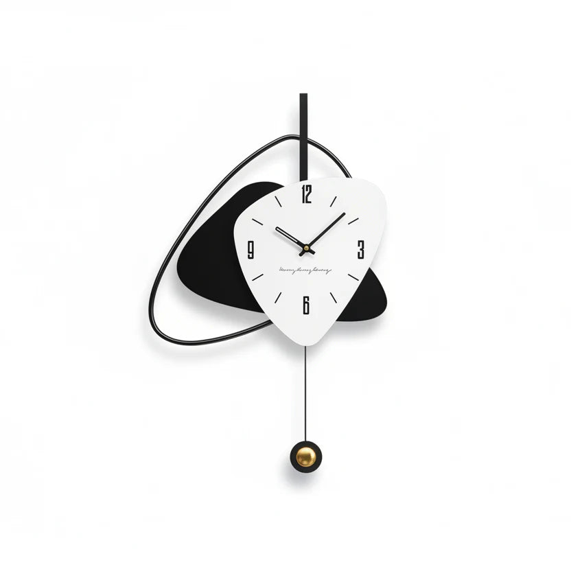 Kjo orë muri me dizajn modern dhe formë unike është një element dekorativ që tërheq menjëherë vëmendjen në çdo ambient. Kombinimi i formave gjeometrike dhe kontrasti i ngjyrave krijojnë një pamje bashkëkohore, ndërsa lavjerrësi i artë i shton elegancë dhe lëvizje të butë hapësirës.