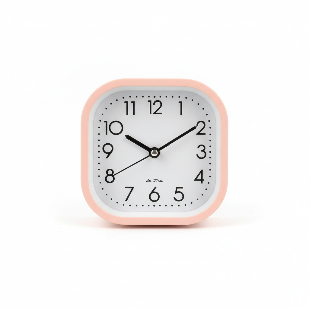 Orë muri analoge me formë katrore me cepa të rrumbullakosur, kornizë rozë dhe fushë të bardhë që sjell stil modern minimalist në çdo ambient.