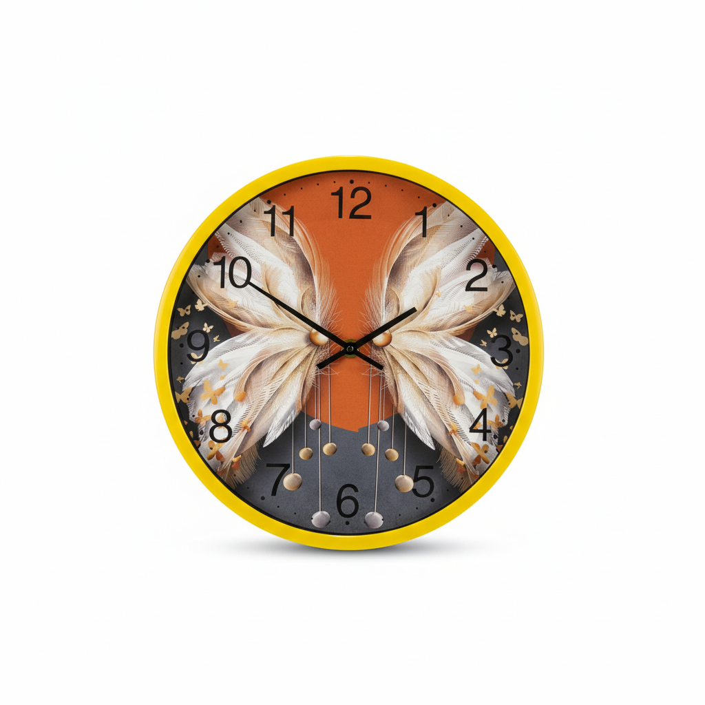 Kjo orë muri rrethore sjell një kombinim elegant të kornizës plastike të verdhë me një fushë artistike me ilustrim fluturash dhe puplash, duke u bërë pikë fokale në çdo dhomë. Shifrat arabe nga 1 në 12 janë të mëdha dhe të qarta, për një lexim të shpejtë të orës.