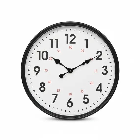 Ora analoge me formë rrethore kombinon një kornizë të zezë elegante me siperfaqe të bardhë për pamje të pastër dhe neutrale në çdo ambient. Shifrat e mëdha arabe në ngjyrë të zezë dhe shenjat e kuqe nga 0–60 brenda rrethit të orëve e bëjnë leximin e kohës të shpejtë dhe të saktë. Akrepat e zinj për orën dhe minutën theksojnë stilin klasik, duke u përshtatur si për shtëpi ashtu edhe për zyra.