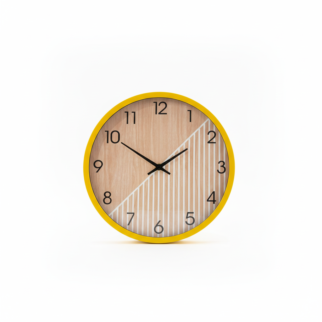Orë muri rrumbullake analoge me kornizë të verdhë dhe sfond me efekt druri, e kompletuar me dizajn gjeometrik me vija për një pamje moderne dekorative.