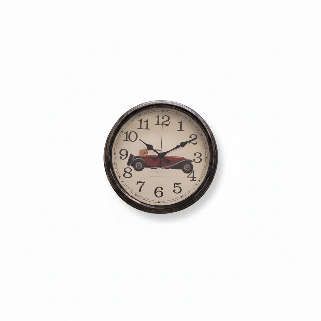 Kjo orë muri me dizajn retro dhe ilustrim të një makine klasike sjell një atmosferë nostalgjike dhe të ngrohtë në çdo ambient. Korniza e errët dhe sfondi me tone të buta krijojnë një pamje harmonike, ndërsa detaji i makinës i shton karakter dhe stil unik.