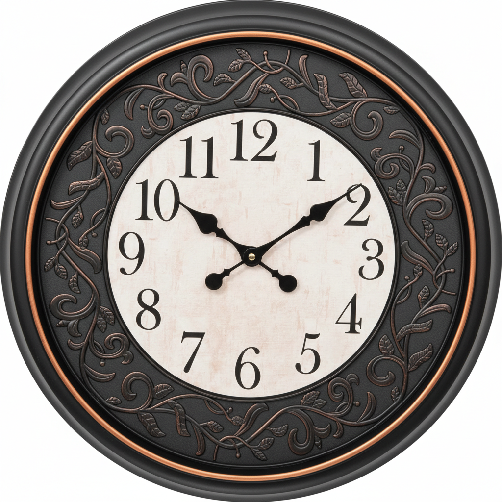 Kjo orë muri rrethore sjell një stil të ngrohtë klasik në çdo ambient falë kornizës në pamje druri dhe motivit dekorativ me gjethe në bordurë. Fusha në ngjyrë bezhë dhe numrat e mëdhenj arabë sigurojnë lexueshmëri të lartë edhe nga larg. Ajo kombinon funksionalitetin praktik me një dizajn dekorativ që e bën të përsosur si për dhomën e ndenjjes, korridorin apo zyrën.
