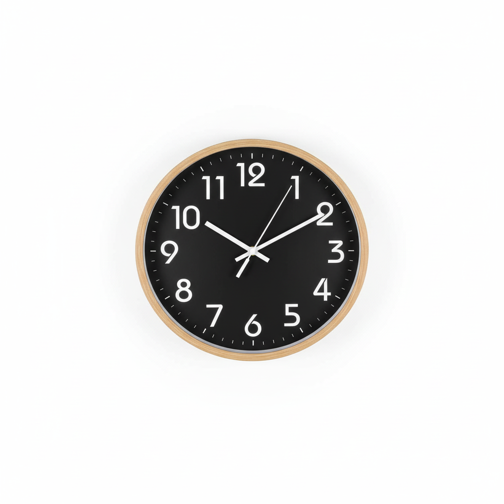 Orë muri rrethore me dizajn minimalist, me kornizë druri të çelur dhe fushë të zezë që krijon kontrast të fortë me shifrat e bardha. Ideale për çdo ambient ku kërkohet lexueshmëri e lartë dhe stil modern.
