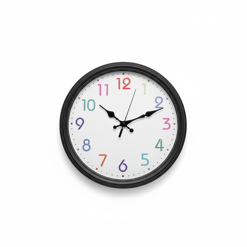 Orë muri rrethore analoge me kornizë të zezë dhe sfond të bardhë, e dallueshme falë numrave arabë shumëngjyrësh. Dizajn i thjeshtë dhe i dukshëm që i jep gjallëri çdo ambienti.