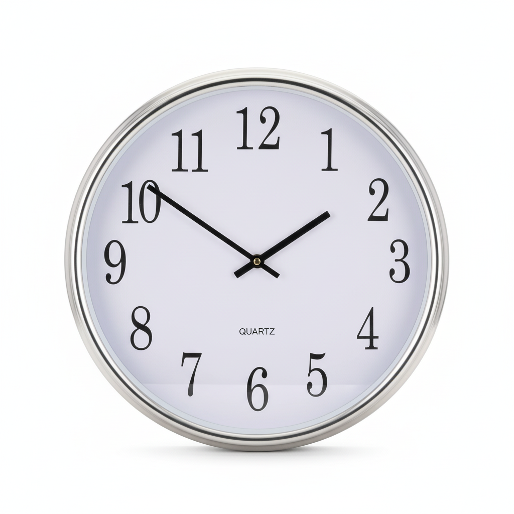 Ora murale analoge rrethore me sfond të bardhë dhe numra arabë të zinj ofron lexim të qartë të orës, ndërsa korniza në ngjyrë argjendi i jep murit një pamje të pastër dhe moderne.