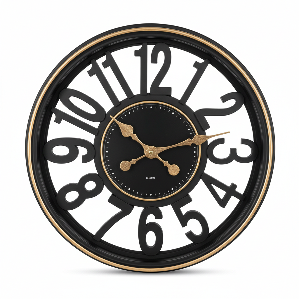 Kjo orë muri rrethore sjell një kombinim të sofistikuar të kornizës gold me dizajnin e hapur në ngjyrë të zezë, duke u bërë aksesor dekorativ në çdo dhomë. Numrat arabë 3D të prerë ofrojnë lexueshmëri të lartë dhe një pamje unike, ndërsa akrepat dekorativë në ngjyrë ari i japin një prekje luksoze murit tuaj. Mekanizmi Quartz siguron matje të qëndrueshme të kohës për përdorim të përditshëm në shtëpi ose zyrë. Produkti vjen i montuar në paketim kartoni të hapur, gati për t’u varur ose për t’u dhuruar.
