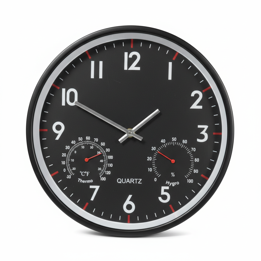 Kjo orë muri analoge me mekanizëm Quartz kombinon stilin modern me funksionalitetin praktik për çdo ambient shtëpie apo zyre. Fusha e zezë me numra arabë të bardhë dhe shenja të kuqe për minutat ofron lexueshmëri të lartë nga çdo distancë. Korniza e zezë me brez të brendshëm argjendi i jep një pamje elegante dhe neutrale që përshtatet lehtësisht me çdo dekor. Dizajni me tre akrepa (orë, minuta, sekonda) siguron matje precize dhe të qartë të kohës.