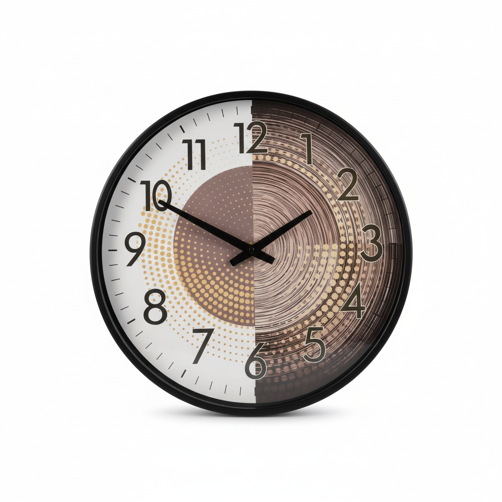 Orë murale analoge rrethore me numra të mëdhenj arab dhe cip abstrakte dyngjyrëshe me pika dhe vija rrethore, ideale për një prekje moderne në shtëpi ose zyrë.