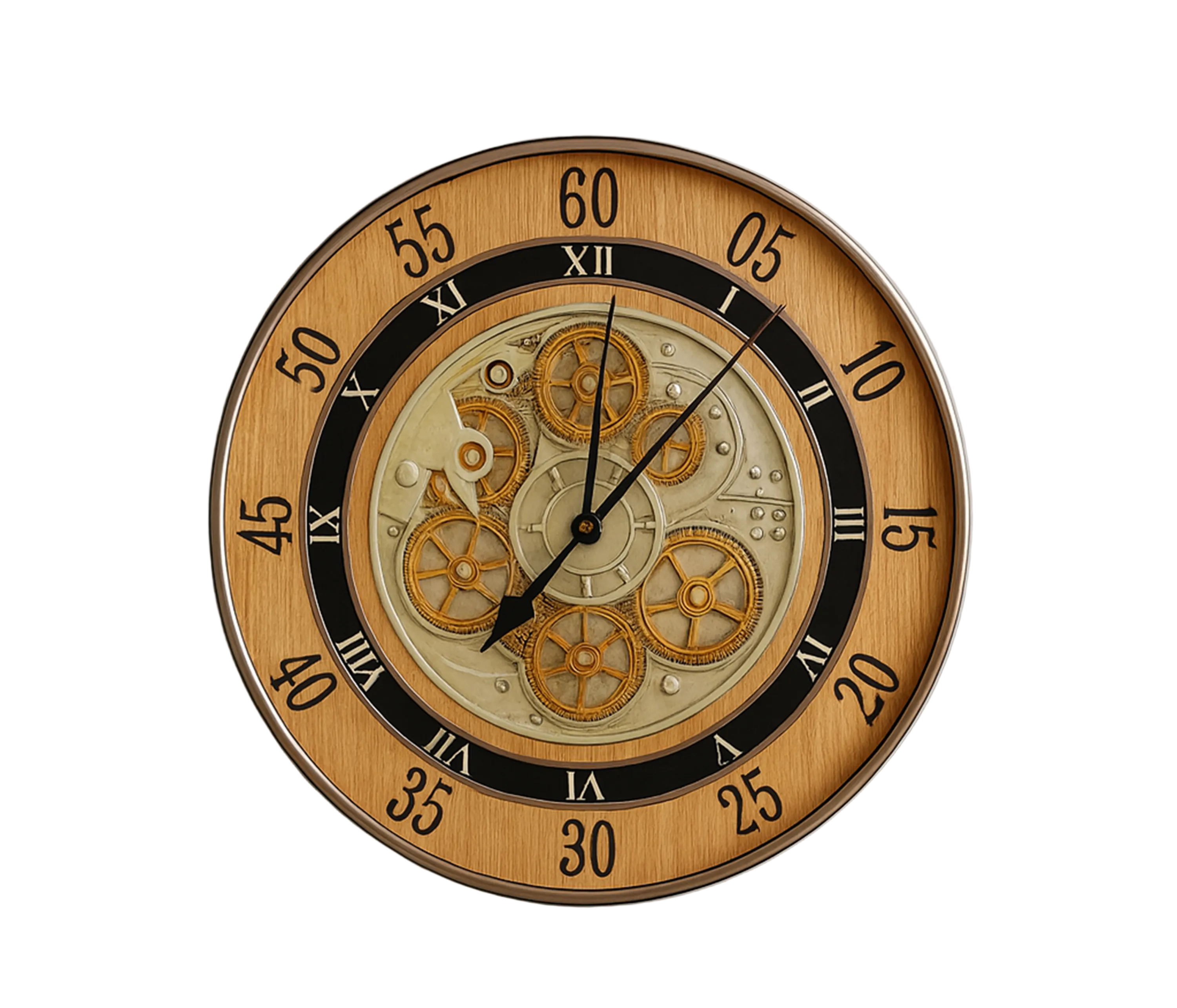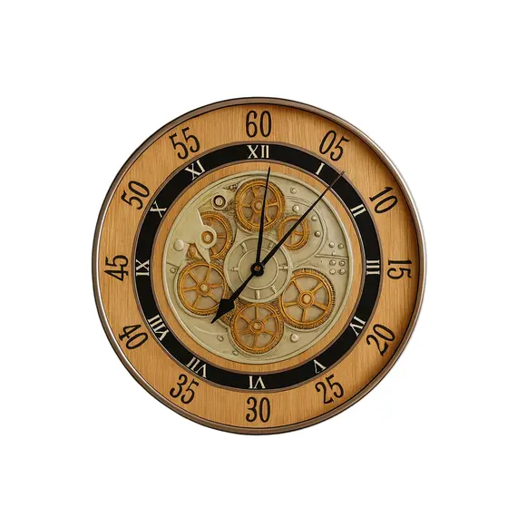 Orë muri me stil industrial dhe elemente dekorative që imitojnë mekanizmin e ingranazheve, duke krijuar një pamje moderne me prekje vintage. Korniza me efekt druri dhe numrat e kombinuar romakë dhe arabë e bëjnë këtë orë një element tërheqës në çdo ambient.
