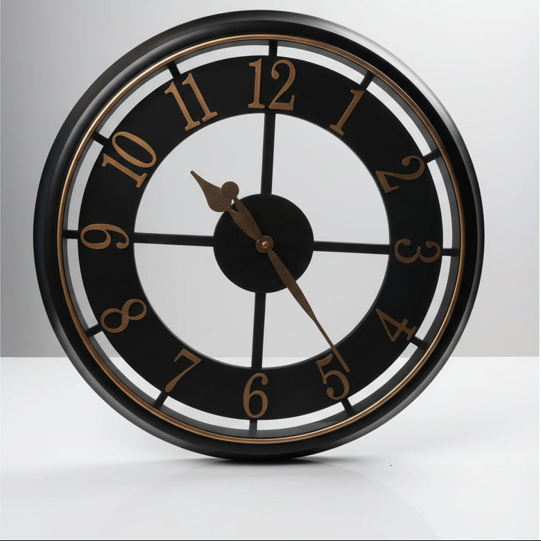 Kjo orë muri dekorative kombinon dizajnin industrial me elemente vintage, duke krijuar një aksesor unik për çdo ambient. Korniza e zezë me detaje bronzi dhe numra të mëdhenj ofron lexueshmëri të shkëlqyer dhe një pamje shumë elegante.